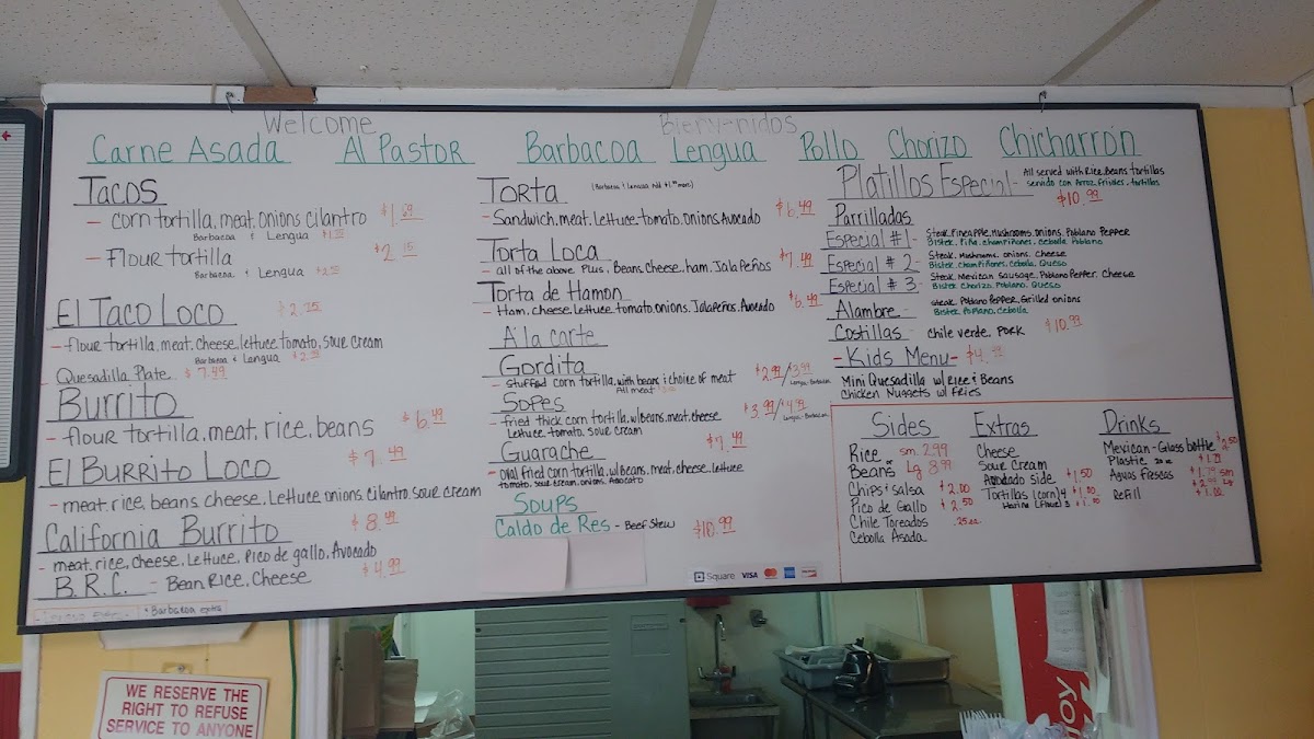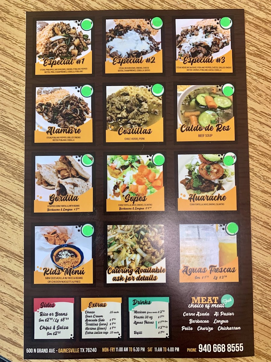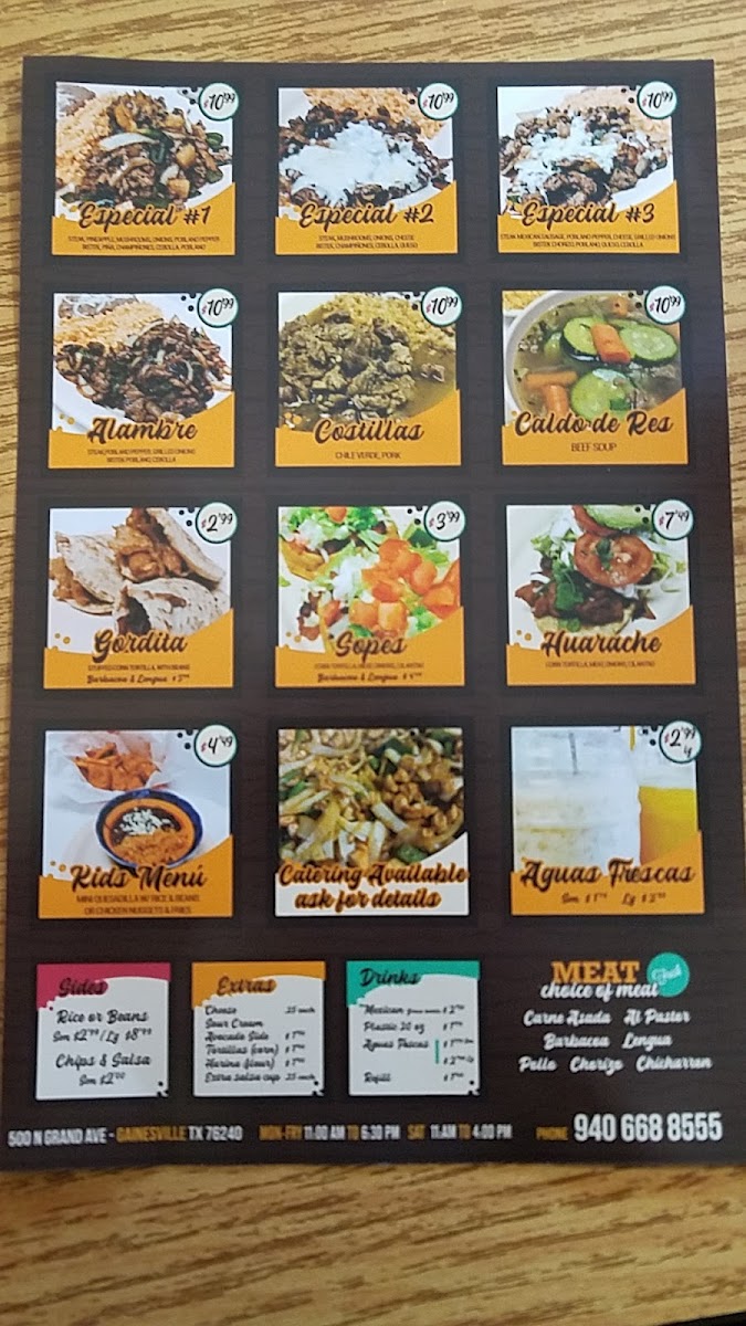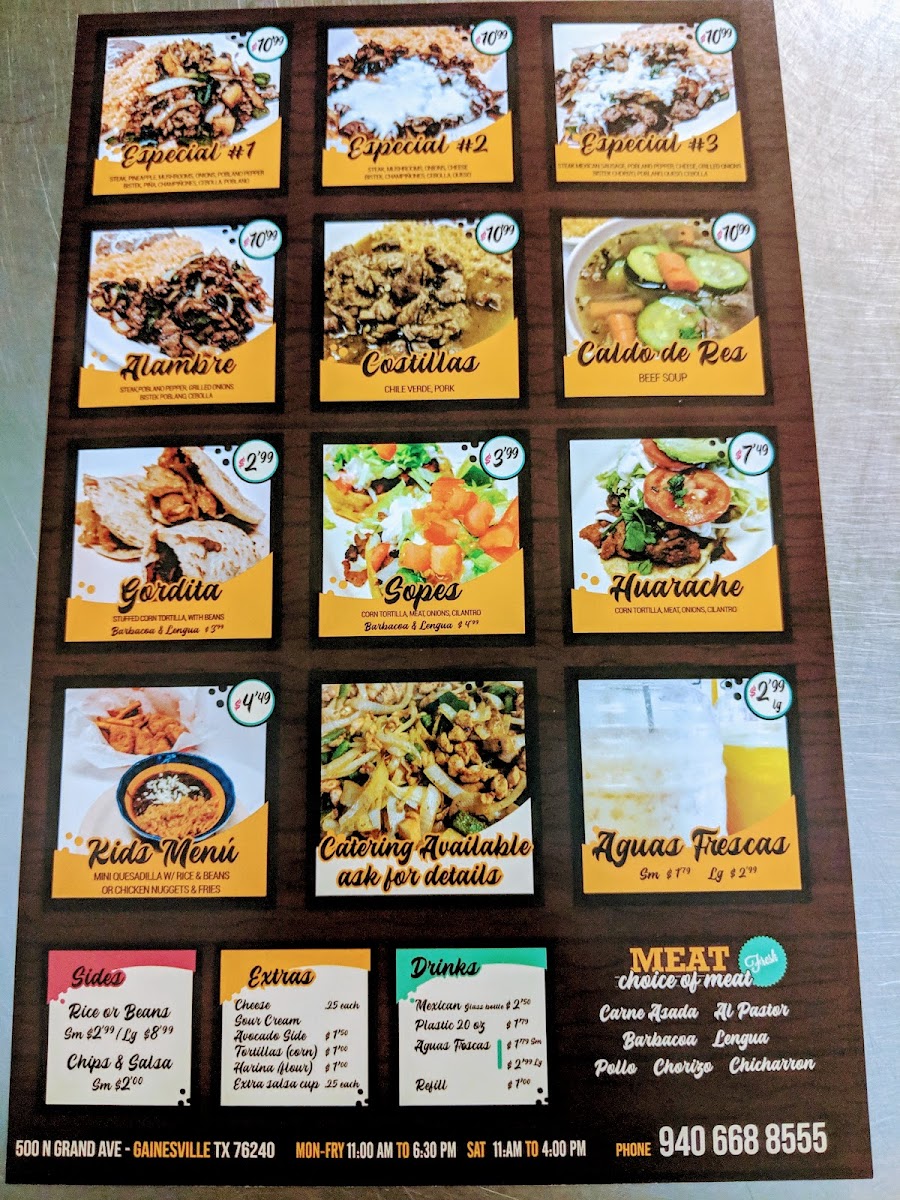The menu at Taqueria Taco Loco in Gainesville, TX, offers a delightful range of Mexican dishes, with something for everyone. For those seeking a simple yet satisfying meal, the Gordita and Guarache from the A La Carte section provide hearty options. If you're in the mood for something more indulgent, the Alambre from the Platillos Especial is a must-try. Accompany your meal with sides like Rice, Beans, Pico de Gallo, Chile Toreados, or Cebolla Asada, each of which enhances the flavors of your dish. For an added touch, you can include Cheese or Tortillas as Extras. The menu also features crowd-pleasers such as the El Taco Loco, Quesadilla Plate, and the popular California Burrito. For something soothing and flavorful, the Caldo de Res offers a warm and comforting option. Whether you're stopping by for a quick snack or a full meal, Taqueria Taco Loco has a delicious selection that promises to satisfy every craving.
